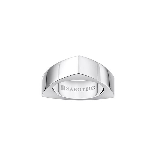The Pyramid Ring is a heavy three-sided ring easily slipped onto the finger, made of 925 sterling silver. The smooth sides meet at three sharp points. Its power lies in its ability to have as much appeal in its solitude as it does in mixed company. The inside is engraved with the Saboteur signet.