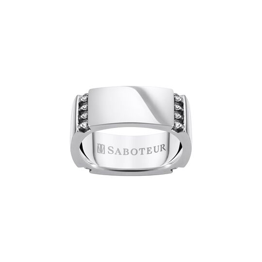 The Broad Elemental Ring is flanked with four rows of dimensional Mortal Skulls on all four sides of the broad silver geometrically-constructed ring made from 925 Sterling Silver. On one side, the SABOTEUR namesake is engraved.