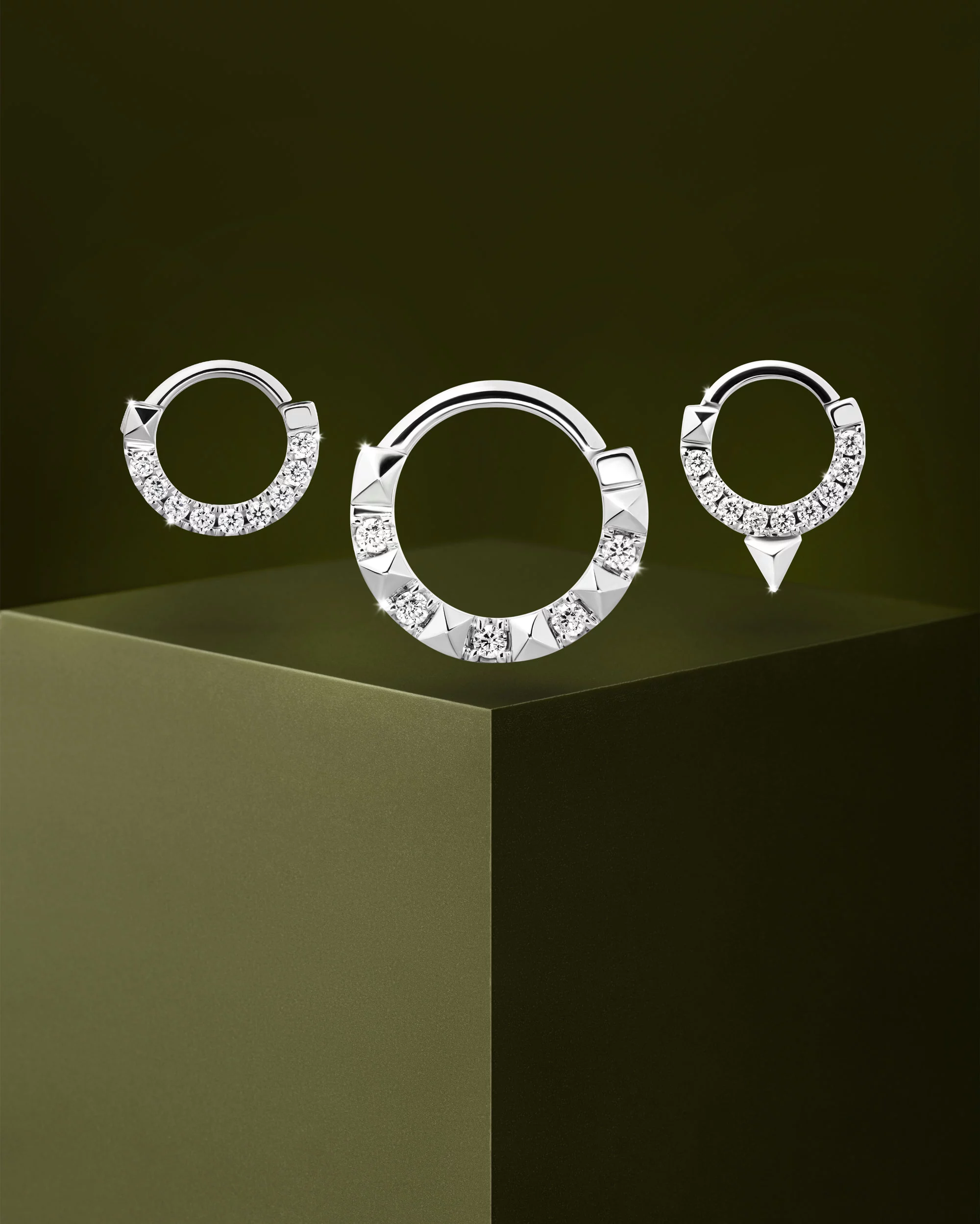 The SABOTEUR Piercing Collection includes a plethora of designs and styles to let you create a look that reflects your own personal body artistry. Discover our range of small nose piercings hand-crafted in 18-carat white, yellow or rose gold in our online shop and in stores – mono-coloured, bi-coloured or embellished with gemstones. The designs are enhanced with white and black (heated) diamonds, as well as emeralds, sapphires, rubies and other gemstones. Freshwater cultured pearls exude their powerful lustre in timeless nose piercings. And if you opt for a double-nostril piercing, you can create customised fashion designs by wearing contrasting or coordinating designs together. Unleash your creativity by combining nose piercing studs with septum piercing hoops and rings.