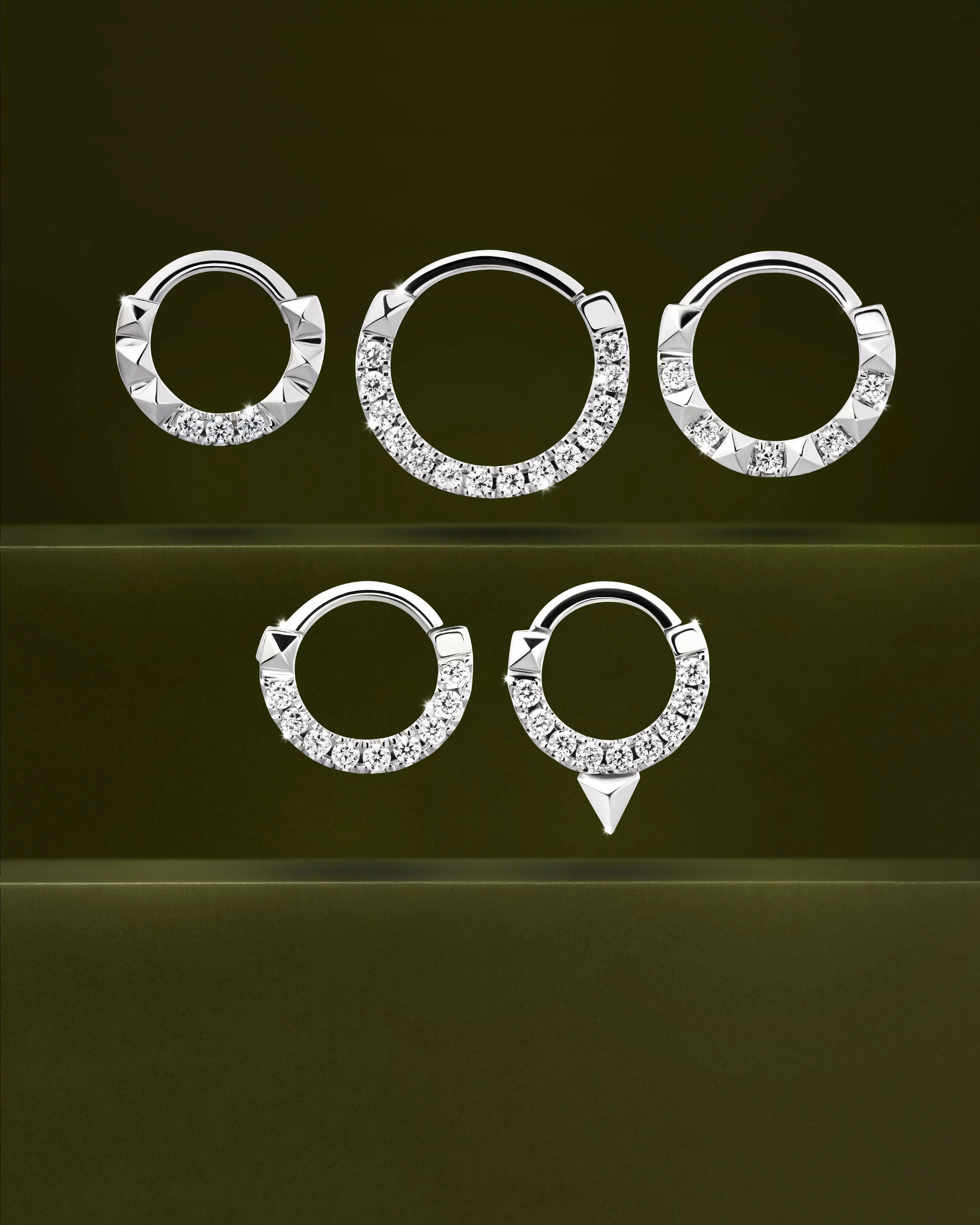With nostril piercings, the piercing goes through the right or left cartilage tissue of the nose. Whether you opt for a single or double piercing, on one or both sides – your choice of the position, number and arrangement of the piercings expresses your own personal style to the world. Piercings that sit a little higher are known as high-nostril piercings. SABOTEUR has the widest range of shapes and sizes of studs to adorn the outside of the nostril. Select from a gleaming yet minimalist nose ring or hoop embellished with sparkling gemstones.